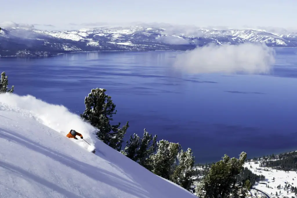 Heavenly boasts some of the largest and highest ski terrain in the Lake Tahoe area, with over 4,800 acres of skiable terrain, a summit elevation of 10,067 feet (3,068 meters), and a vertical drop of over 3,800 feet. The resort features 97 trails, offering a diverse experience that caters well to all ability levels, particularly intermediates. Skiers can enjoy everything from wide, groomed cruisers and serene tree skiing to challenging double-black-diamond chutes in Mott and Killebrew Canyons. The mountain is known for its incredible views, allowing you to see the deep blue of Lake Tahoe on the California side and the high desert of Nevada on the other. The snow at Heavenly is plentiful, as large snow storms roar in off the Pacific Ocean and slam into the Sierra Nevada Mountains. The combination of cold air and lofty peaks delivers excellent powder during the cold winter months, which ensures a long spring skiing season.